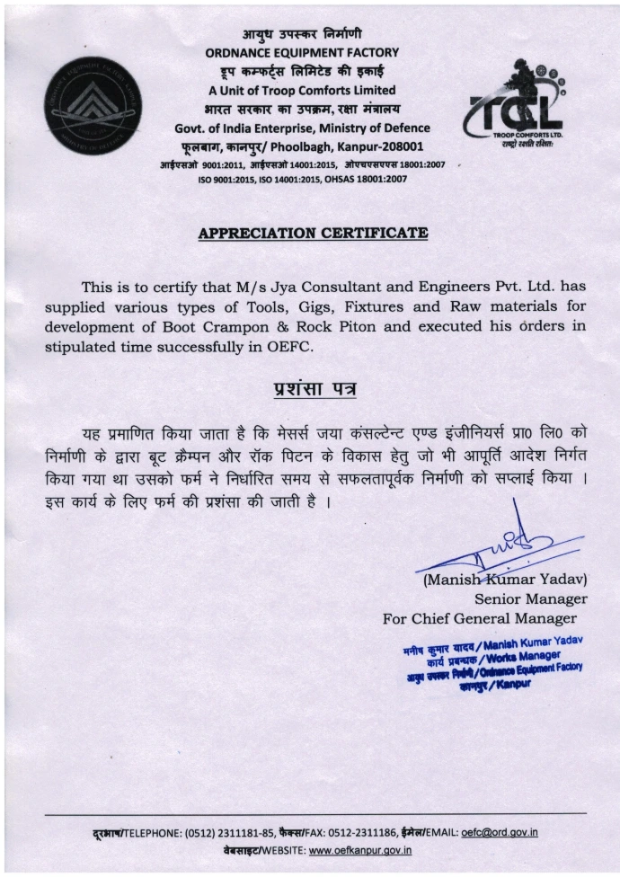 We are proud to be recognized with an Appreciation Certificate from the Ordnance Equipment Factory, a unit of Troop Comforts Limited under the Ministry of Defence, Government of India. This recognition acknowledges our successful and timely supply of specialized tools, jigs, fixtures, and raw materials for the development of critical equipment such as Boot Crampons and Rock Pitons—demonstrating our commitment to precision, reliability, and engineering excellence.
